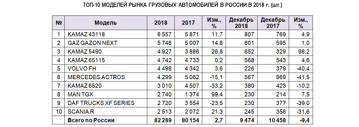 В модельной структуре рейтинга лидером, как и в 2017 году, остался КАМАЗ-43118, показатель которого составил 6,6 тыс. экземпляров (+11,7%). Следом идут: «ГАЗон NEXT» (5,7 тыс. шт.; +14,8%), КАМАЗ-5490 (4,9 тыс. шт.; +26,8%), КАМАЗ-65115 (4,7 тыс. шт.; +0,2%) и Volvo FH (4,5 тыс. шт.; +3,6%).
