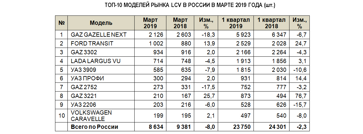 По данным экспертов, в марте 2019 года объем рынка новых легких коммерческих автомобилей (LCV) в России составил 8,6 тыс. единиц, что на 8% меньше, чем в марте 2018 года.