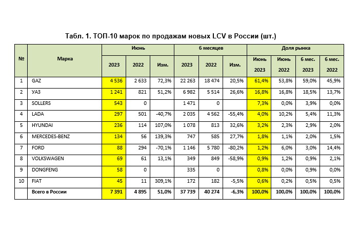 В июне текущего года в России был продан 7391 новый легкий коммерческий автомобиль – на 51% больше, чем за первый летний месяц 2022 года.