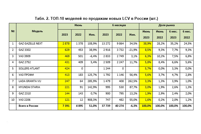 Рейтинг по продажам среди моделей по итогам июня возглавляет «ГАЗель Next» с результатом 2878 реализованных машин. Далее с большим отставанием следуют такие автомобили, как ГАЗ 3302 (629 ед.), УАЗ 3909 (469 ед.), ГАЗ 2752 (431 ед.) и Sollers Atlant (424 ед.).
