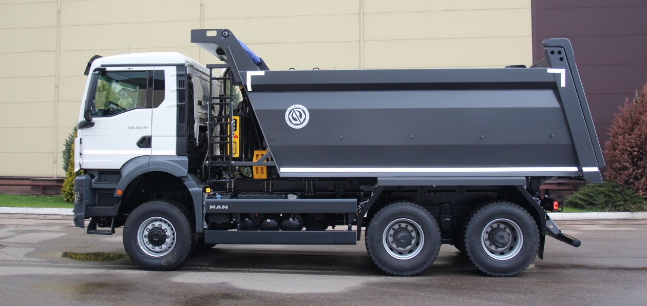 Боковые борта кузова имеют формованные продольные гибы, задний борт – принудительную фиксацию; конструкцией предусмотрены защитный козырек на переднем борту против осыпания над гидроцилиндром и металлические крылья над колесами задних мостов.