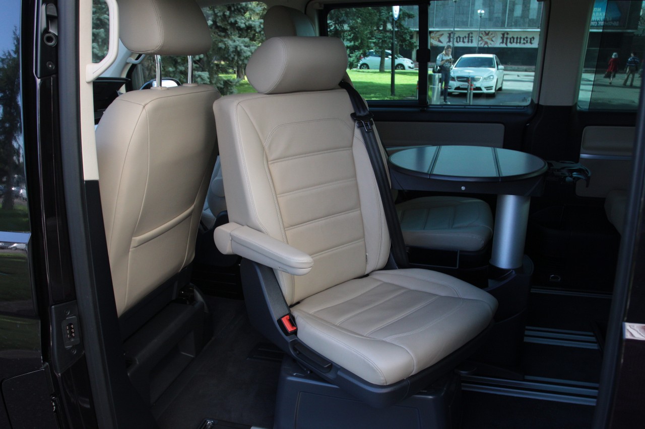 Два отдельных кресла с подлокотниками и регулировками двигаются во всех возможных направлениях, включая вращение на 360 градусов. Под каждым из них вместительный ящик. Огромный диван с широченным подлокотником тоже регулируется и двигается, и тоже скрывает в своих недрах отсеки под хранение вещей. Ну и на десерт – ездящая по салону стол-тумба-трансформер, вмещающая в себя к тому же несколько отсеков для мелочёвки и целую группу подстаканников. В принципе, если дополнительно заказать заднюю полку-кровать, то Multivan полностью выполнит задачи премиум-кемпера.