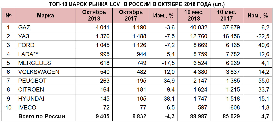 Пятерка лидеров в течение всего 2018 года остается неизменной: в нее традиционно входят ГАЗ, УАЗ, Ford, Lada и Mercedes-Benz. На долю ГАЗа, который возглавляет рейтинговую таблицу, пришлось 43% от общего объема. В количественном выражении это соответствует 4 тыс. автомобилей – на 3,6% меньше, чем год назад.