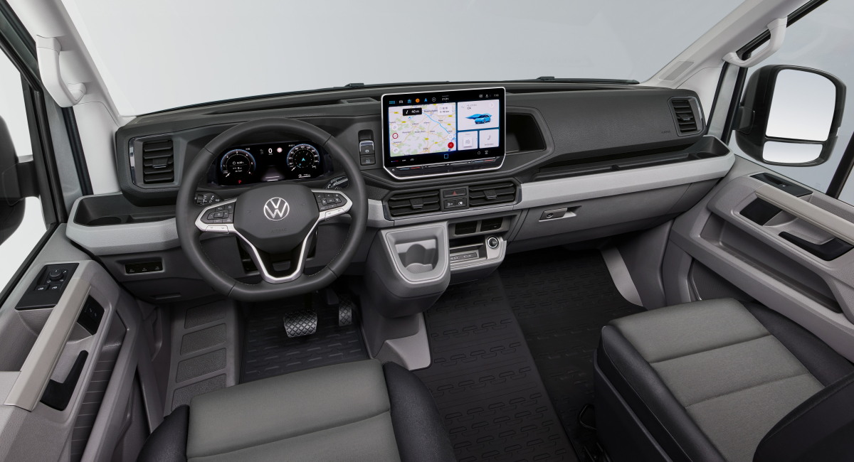 В качестве опций для «Крафтера» стали доступны голосовой ассистент с ChatGPT и электронный стояночный тормоз с функцией Auto Hold. На автомобилях с 8-ступенчатым «автоматом» (он также идет в качестве опции) селектор трансмиссии выполнен в виде подрулевого рычажка.