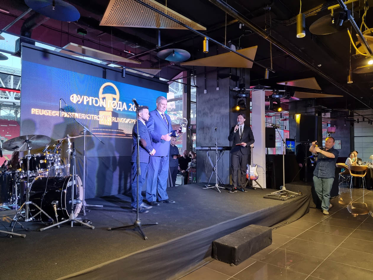 Тройка победителей в номинации «Фургон/малотоннажник/микроавтобус года»: Peugeot Partner / Citroën Berlingo / Opel Combo Cargo. Награду вручил Валерий Попов, директор по продажам и развитию бизнеса компании Magna Seating Rus.