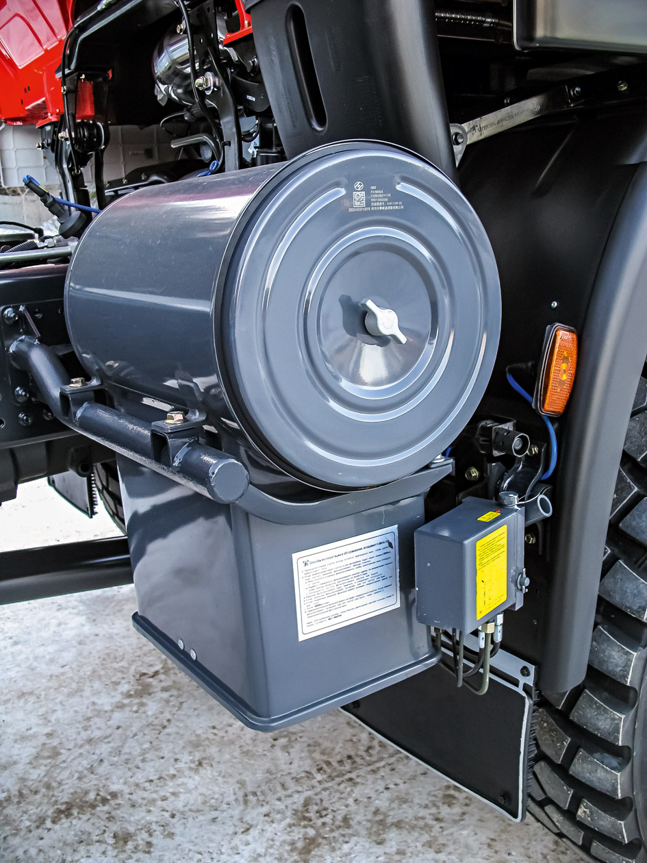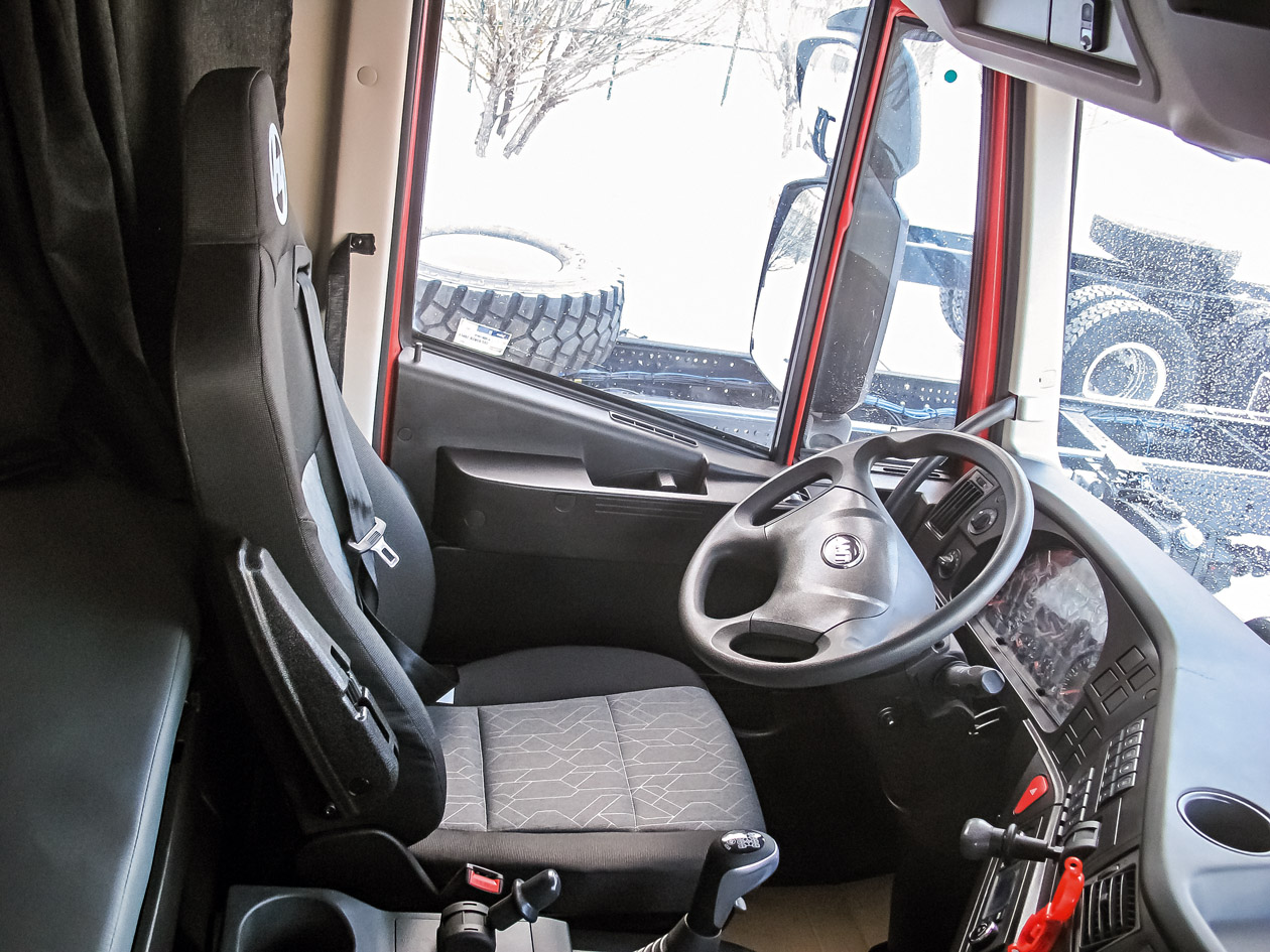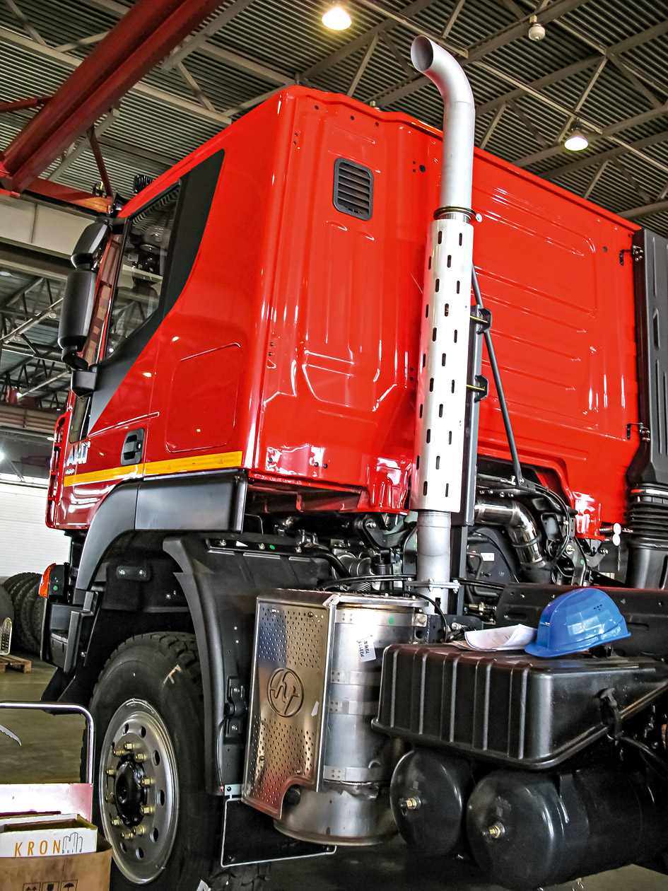 Однако у SAIC-Hongyan несколько другие кабины Iveco: не Trakker шириной 2300 мм снаружи, а Stralis шириной 2500 мм. Именно эти комплектные кабины сейчас привозят из Китая в Миасс. Напомним, что широкие кабины на самосвалах и строительной технике применяет Scania. Подобная унификация помогает сократить расходы на производство кабин и расходы при эксплуатации. Да и между «старой» кабиной Iveco Trakker и новой SAIC-Hongyan различий совсем немного. Да, светотехника другая, но даже бампер остался стальным, трехэлементным, самым правильным для вездеходов. Причем фасад свой, оригинальный, не похожий ни на привычный Iveco Trakker образца 2013 года, ни на дизайн нынешнего европейского Iveco T-Way с узкими блок-фарами.