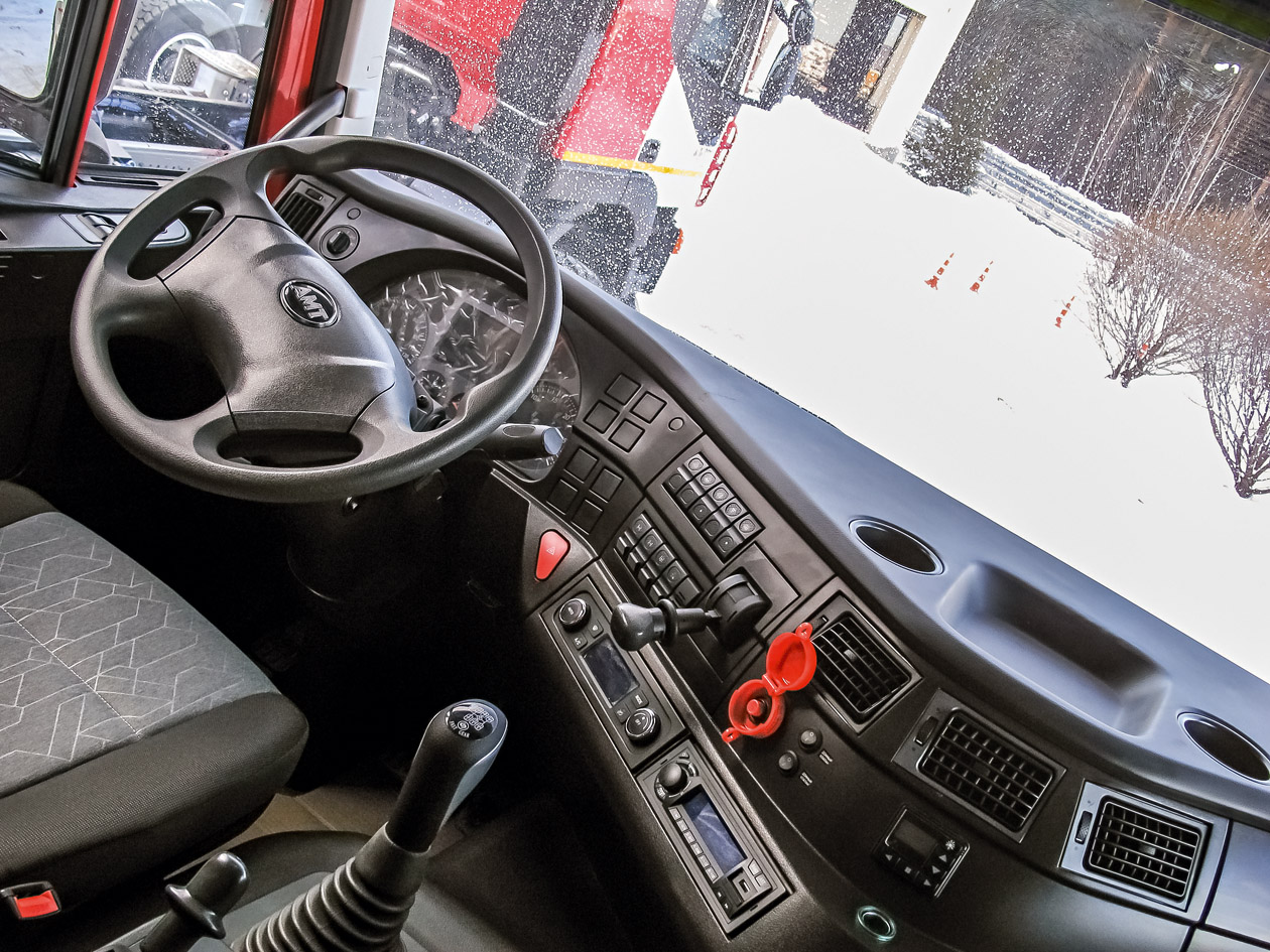 В интерьере — схожая панель приборов и практически копия «ивековских» кресел, а также комбинации приборов. Так что эксплуатантам все будет знакомо. Особенность кабин именно у «АМТ N.V.» — дополнительная теплоизоляция и три варианта «автономок-фенов»: одна мощностью 2 кВт или 4кВт, другой вариант — пара двухкиловаттных.