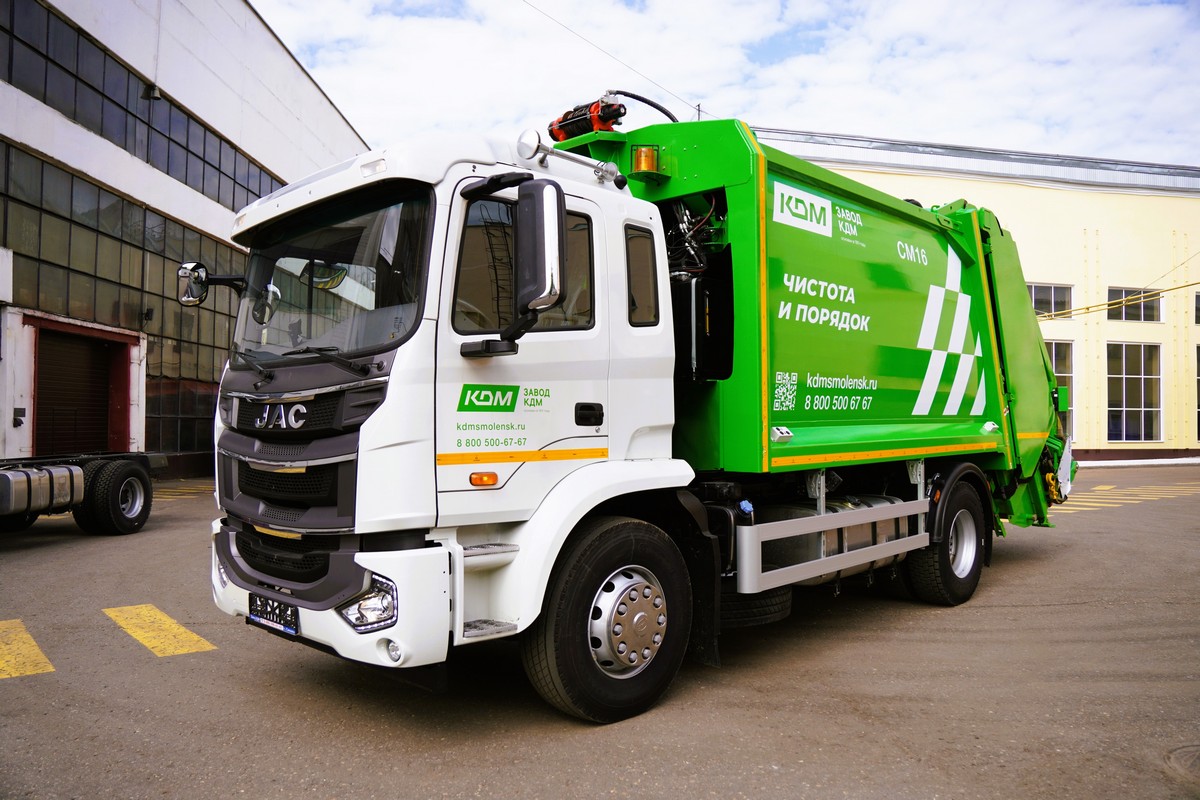 В мае этого года смоленский «Завод КДМ» запустил серийное производство новой модификации мусоровоза СМ16 на шасси JAC N200 с лебедкой для контейнеров скандинавского типа.