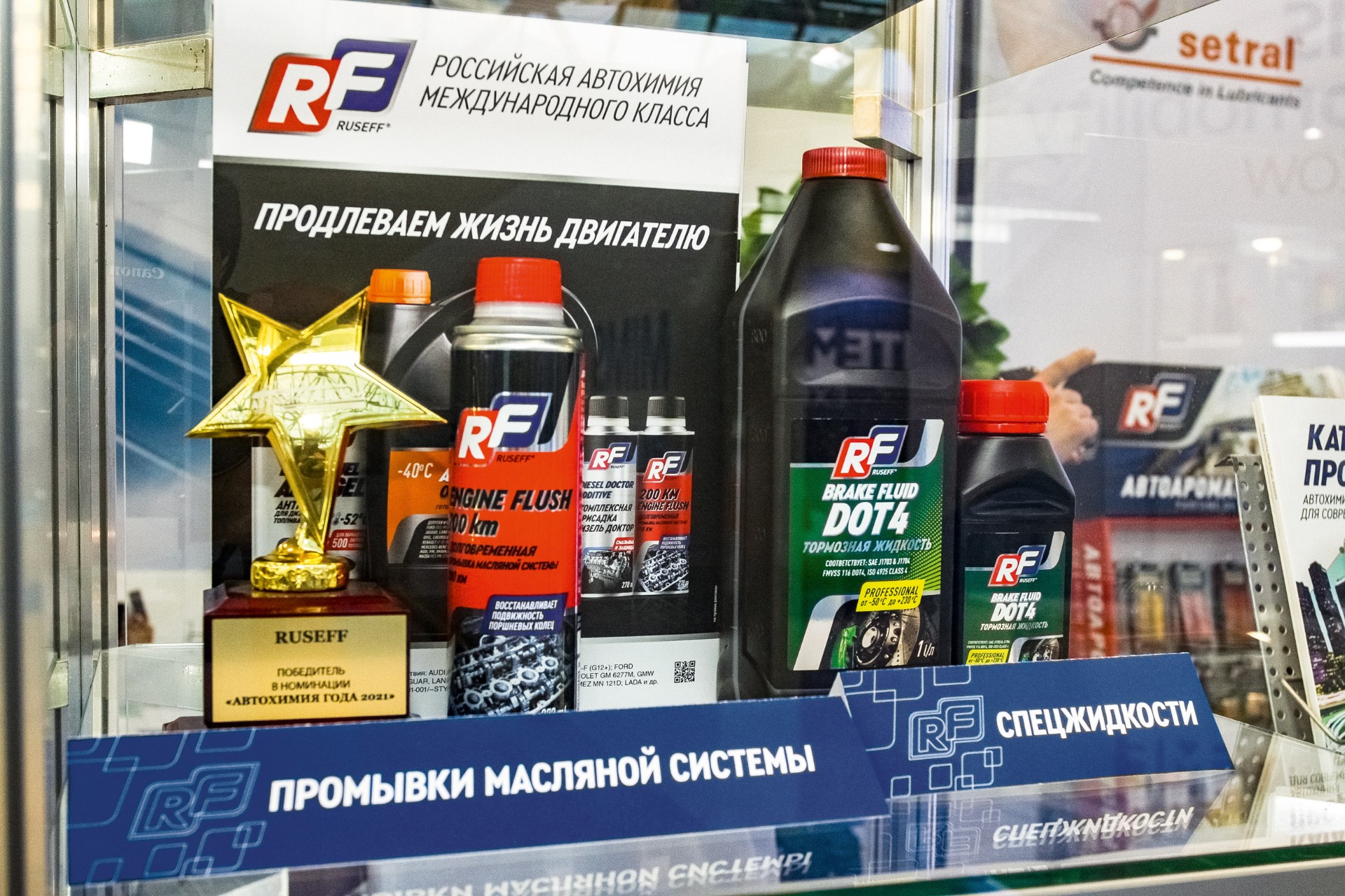 Бренд Ruseff, напротив, изначально задумывался под розницу. В его ассортименте сегодня порядка 170–180 позиций, и он регулярно обновляется (по словам представителей компании, раз в месяц появляется что-то новое). Товарная линейка бренда шире: помимо масел, в ней есть разного рода смазки и очистители, много товаров для ухода за салоном автомобиля и лакокрасочным покрытием, три вида очистителей стекол, антикоррозионные материалы, есть также антифризы, тормозная жидкость и т. д. Кроме того, под брендом Ruseff производятся масла для двухтактных двигателей, а также смазки для цепей бензиновых пил.