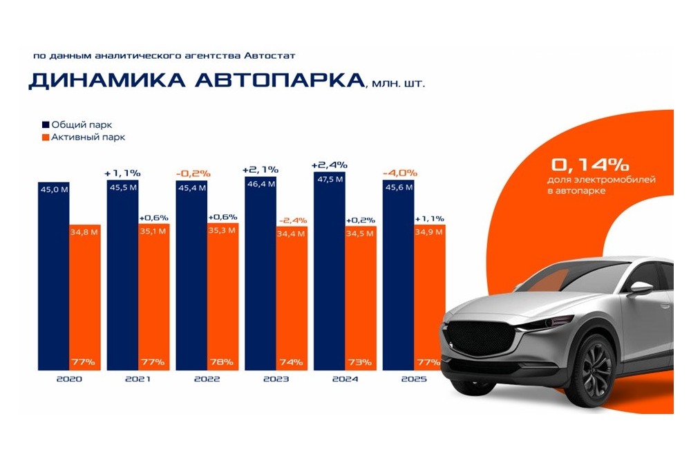 За 10 месяцев прошлого года количество зарегистрированных автомобилей в России снизилось на 4% (до 45,6 млн шт.), однако эксплуатируемый парк увеличился на 1,1% (до 34,9 млн шт). По данным «Автостата», это максимальный прирост активного парка за последние пять лет. Активно эксплуатируются в настоящее время 77% от общего числа автомобилей (отметим, что доля стала больше, чем в предыдущие годы). Доля электромобилей в автопарке составила всего 0,14%.
