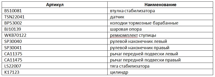 передней газомасляной стойки A61162, заднего амортизатора A22162, тормозных дисков TB219411 и колодок BP43282, а также натяжного ролика поликлинового ремня R14119.