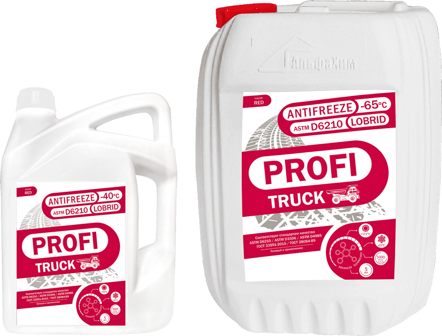 Всесезонные охлаждающие жидкости PROFI TRUCK предназначены для грузовиков и спецтехники, работающих в тяжелых условиях эксплуатации, обладают повышенной защитой от кавитационной коррозии и соответствуют стандартам ASTM D6210, GB 29743-2013 HEC и др. Антифризы изготовлены по лобридной (LOBRID) технологии, когда к карбоксилатной основе добавляют небольшую (как правило, до 10%) долю молибдатных и нитритных ингибиторов коррозии. Линейка PROFI TRUCK также отличается увеличенным ресурсом эксплуатации — пять лет либо 5 тыс. моточасов.