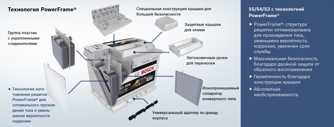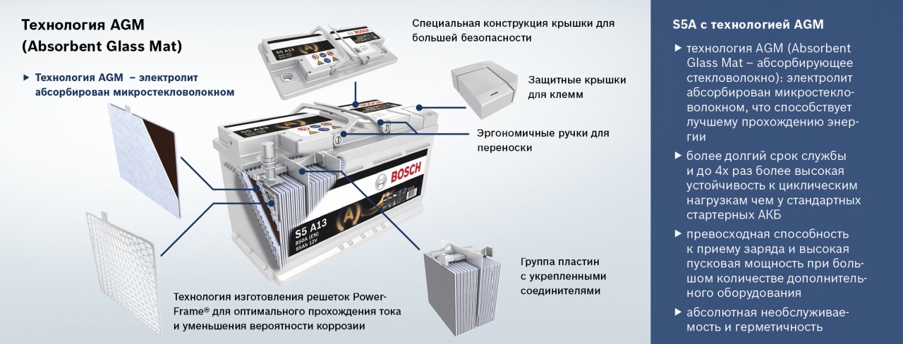 В аккумуляторах премиум-класса применяется технология Absorbent Glass Mat (AGM). Ее использование дало возможность существенно увеличить число циклов разряд/заряд. В соответствии с технологией AGM в конструкции аккумулятора используются специальные сепараторы из стекловолокна, они полностью впитывают в себя электролит, и, таким образом, он находится в нетекучем состоянии. Микропоры материала заполнены электролитом не полностью. Свободный объем используется для рекомбинации газов, что позволило сделать корпус аккумулятора полностью герметичным. Применение технологии AGM обеспечивает хорошую устойчивость аккумулятора к вибрации и наклону. Глубокий разряд не приводит к необратимым последствиям для батарей Bosch S5A.