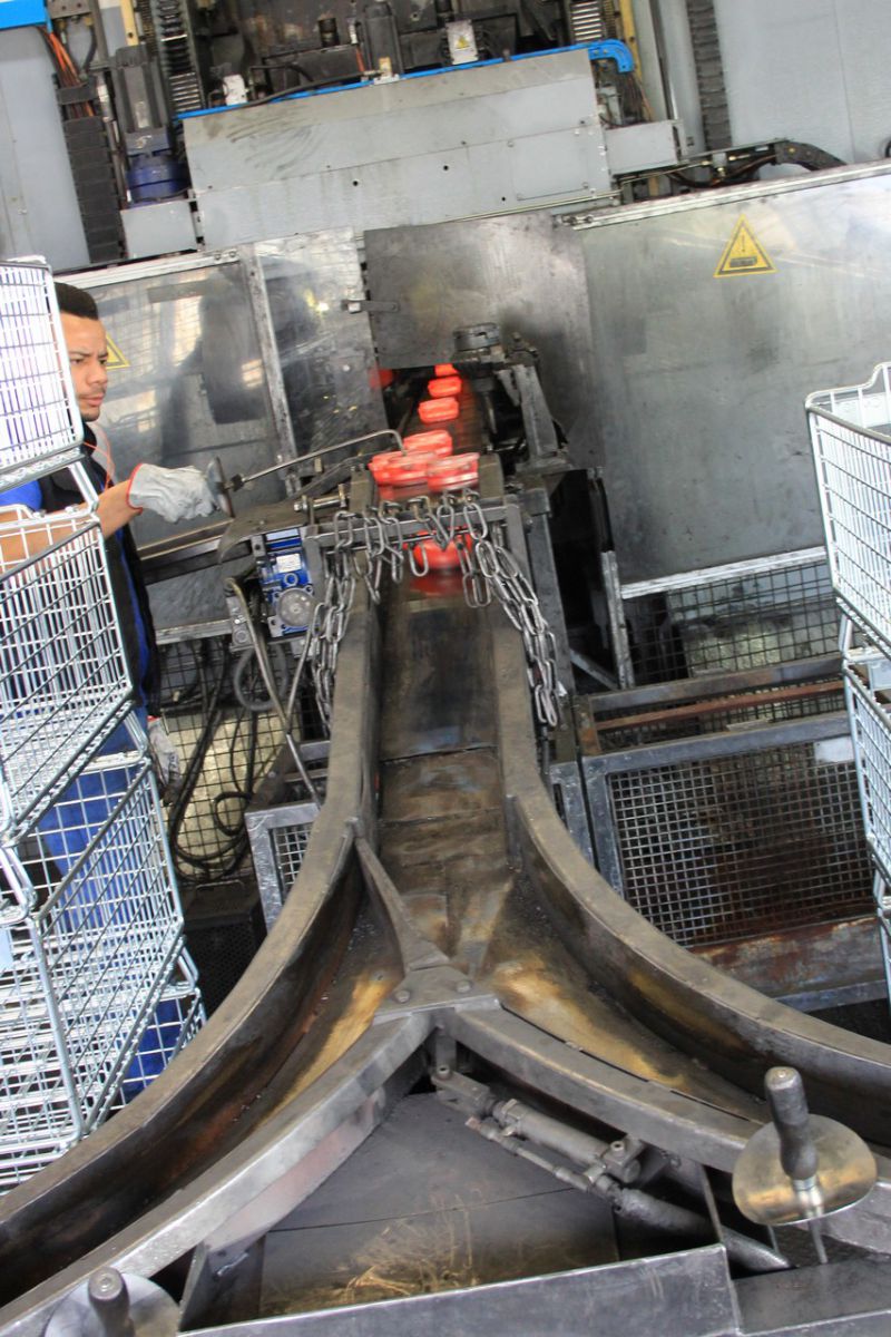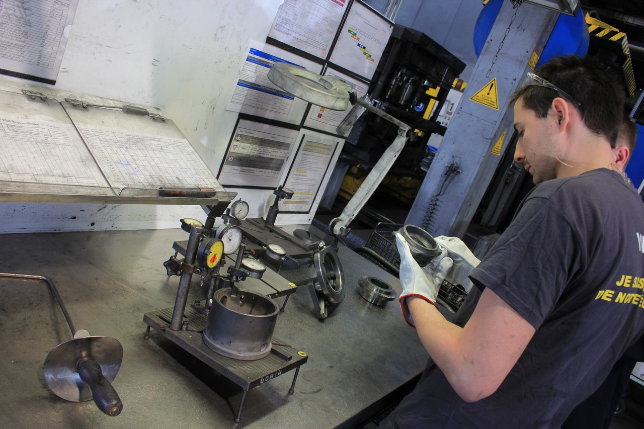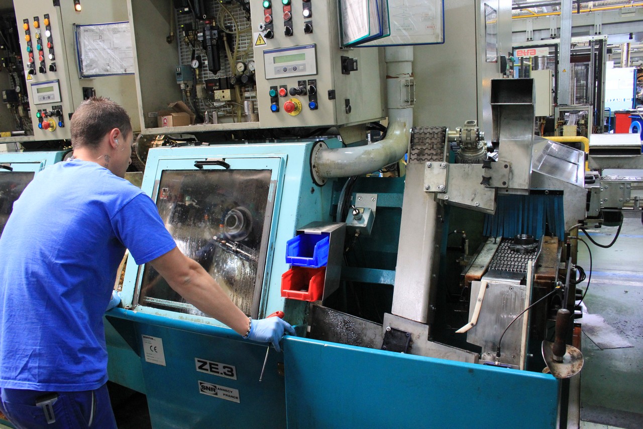 Производство подшипников — не менее высокотехнологичный процесс. Заводы NTN-SNR оснащены оборудованием по обработке металлов давлением, а также уникальными станками, многие из которых разработаны внутри самой компании. «Ручная» проверка также входит в обязательную программу. Прямо рядом с огромным производственным прессом один из сотрудников выборочно берет заготовки и сравнивает их с эталоном, проверяя деталь по всем необходимым геометрическим параметрам. Если хоть один из них не соответствует требованиям, останавливают весь пресс и начинают проверять прессформу.