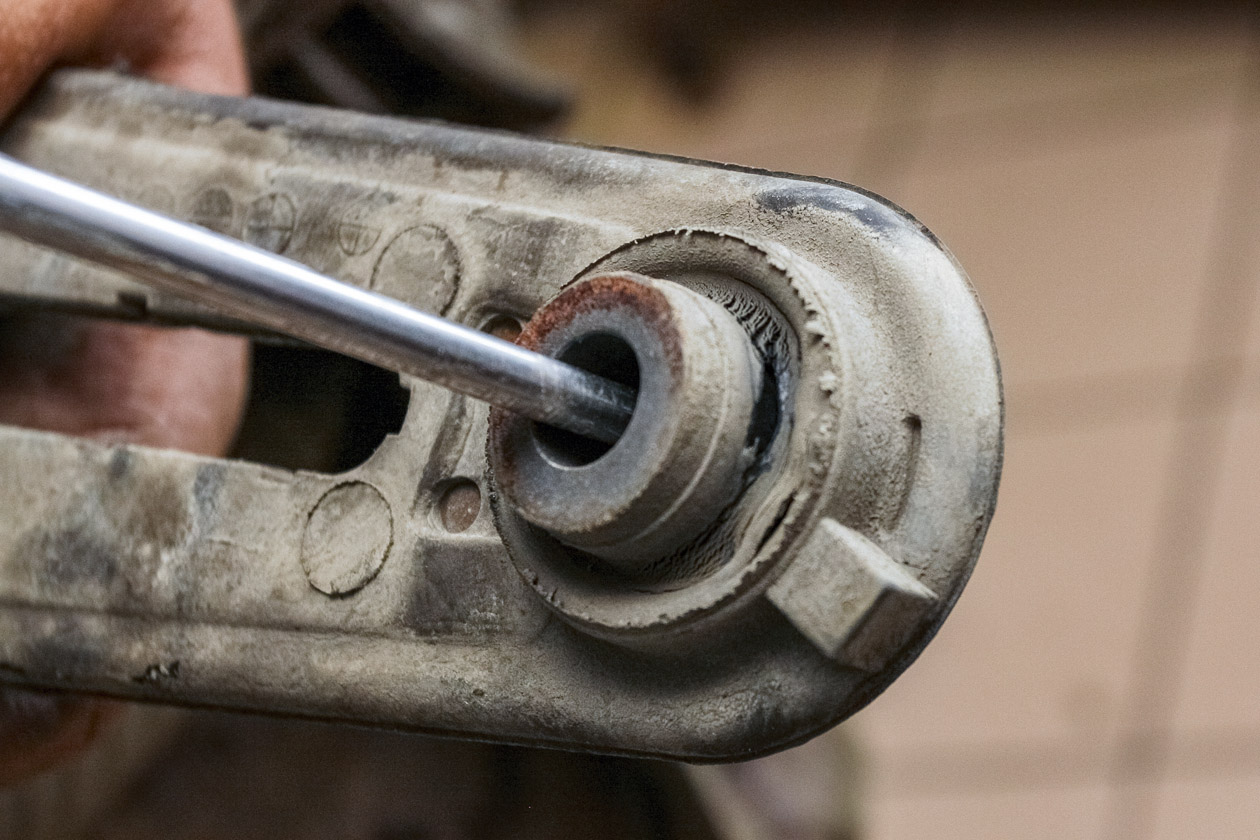 Добраться к задней подушке двигателя довольно легко, но ее демонтаж может оказаться трудоемкой процедурой, так как на машинах с большим пробегом болт закисает намертво