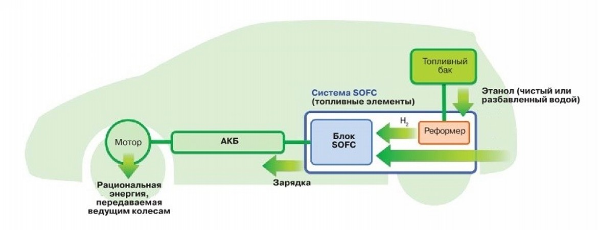 Компания Nissan объявила о разработке силовой установки на основе топливных элементов типа SOFC (Solid Oxide Fuel Cell), работающей на биоэтаноле.