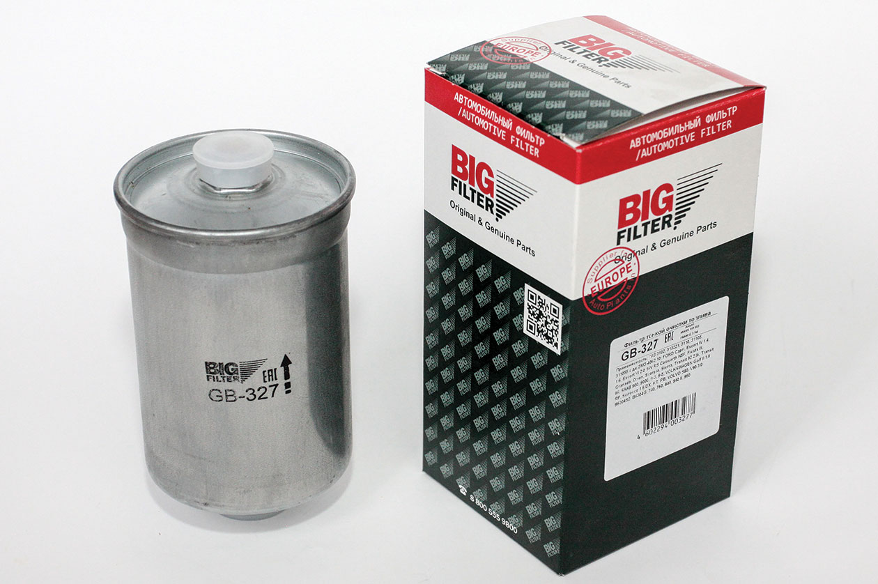 Фильтр GB-327 упакован в точно такую же коробку и отличается только наклейкой. Она столь же информативна, несет информацию о модели, совместимости и применении. В списке автомобилей — впрысковые машины ГАЗ с моторами ЗМЗ, а также множество европейских моделей начала 90-х — марок Ford, Saab и Volvo. Сам фильтр очень большой, корпус из алюминизированной стали. Соединения типа «гайка» с конусным уплотнением. В комплекте идут шайбы. Отверстия закрыты заглушками. Маркировка на корпусе сообщает данные о производителе, модели фильтра и направлении потоков.
