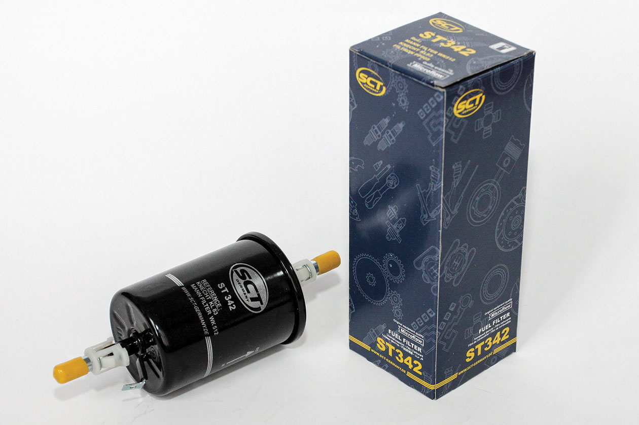Фильтр ST342 подходит для множества бензиновых машин европейских производителей. Поставляется он в фирменной упаковке отличного качества. На ней есть большой список моделей машин, для которых он предназначен, данные о совместимости и производителе. Русский язык также не востребован, зато он есть на сайте, куда можно перейти, считав QR-код с упаковки. Фильтр внутри простой цилиндрический, материал корпуса — сталь. Окрашен в черный цвет. Соединения быстросъемные, закрыты заглушками, установлены пластиковые клипсы-зажимы. Пластмасса упругая и крепкая. На корпусе нанесены данные о модели, производителе, совместимости и стрелка, указывающая направление потока. Присутствует и напоминание о необходимости сброса давления в рампе.