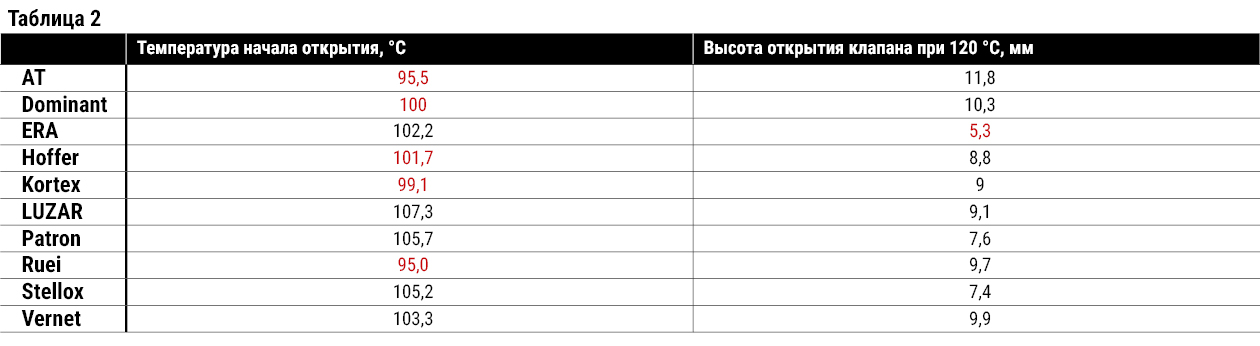 Детали марок AT, Dominant, Hoffer, Kortex, Ruei не соответствуют заявленной температуре начала открытия перепускного клапана термостата. Производители, скорее всего, сэкономили, использовав термоэлементы с пониженной температурой.