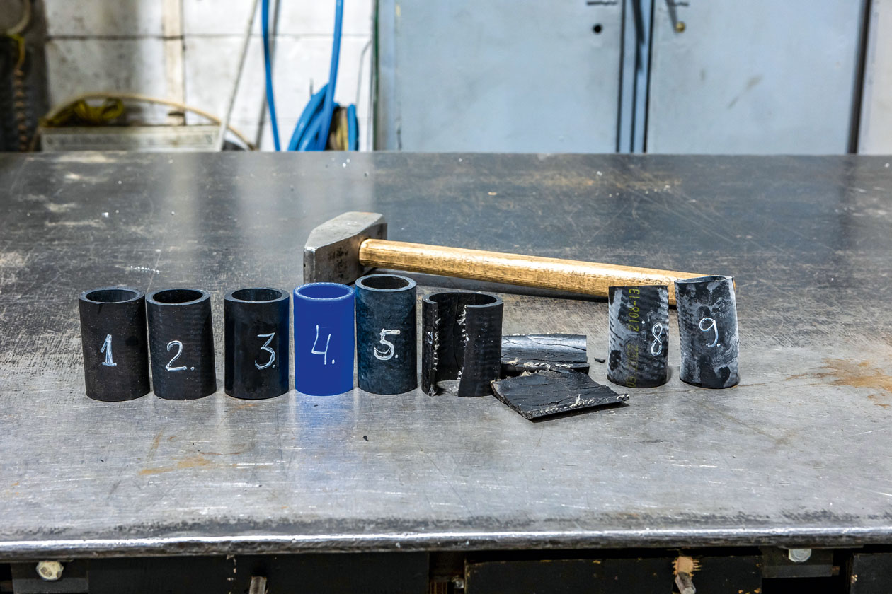 После заморозки мы попробовали сжать заготовленные отрезки патрубков — от этого растрескались патрубки Riginal и «Балаково Запчасть». Чтобы усложнить задачу остальным участникам теста, мы понизили температуру до –50 °C, но даже после заморозки до такой экстремальной температуры все испытываемые образцы остались целы.