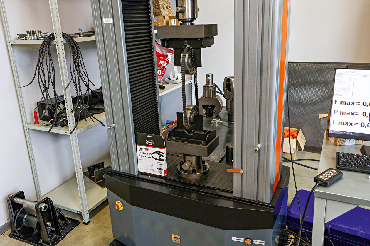 Ремни поочередно устанавливались зубьями наружу на гладкие цилиндрические шкивы и растягивались со скоростью 50 ± 15 мм/мин до разрыва на разрывной машине РЭМ‑300. На этом этапе едва-едва уложился в минимально допустимые показатели ремень бренда Krauf, при этом прочность корда второго ремня после старения оказалась вполне высокой.
