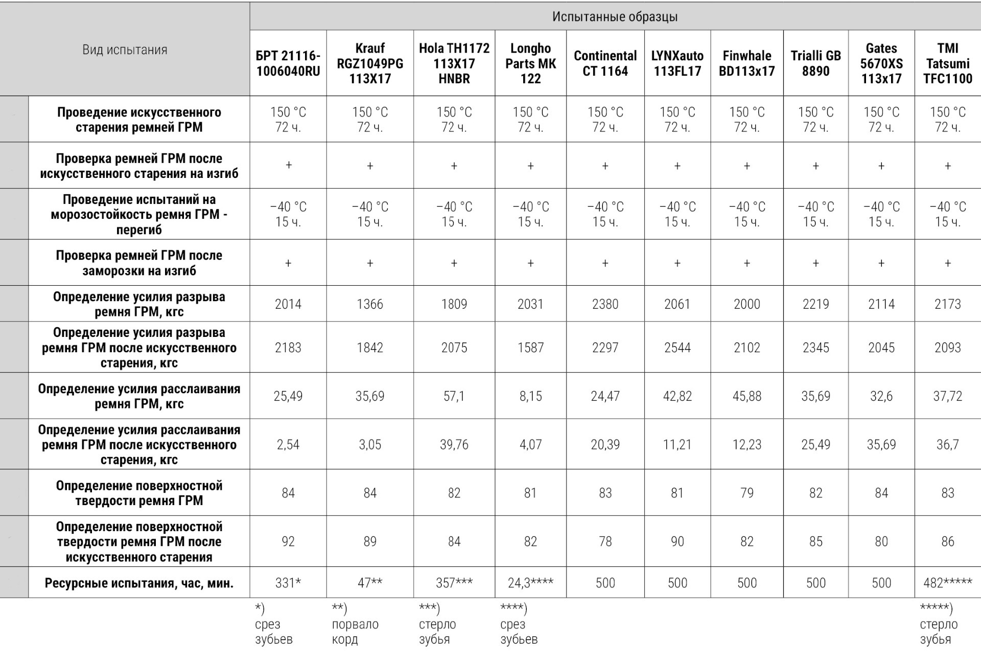 Тест проводился согласно ТУ 38.1051912-90 «Ремни зубчатые с параболическим профилем зубьев для двигателей автомобилей ВАЗ» и ГОСТ Р ИСО 12046-2017 «Ремни приводные синхронные для автомобилей».