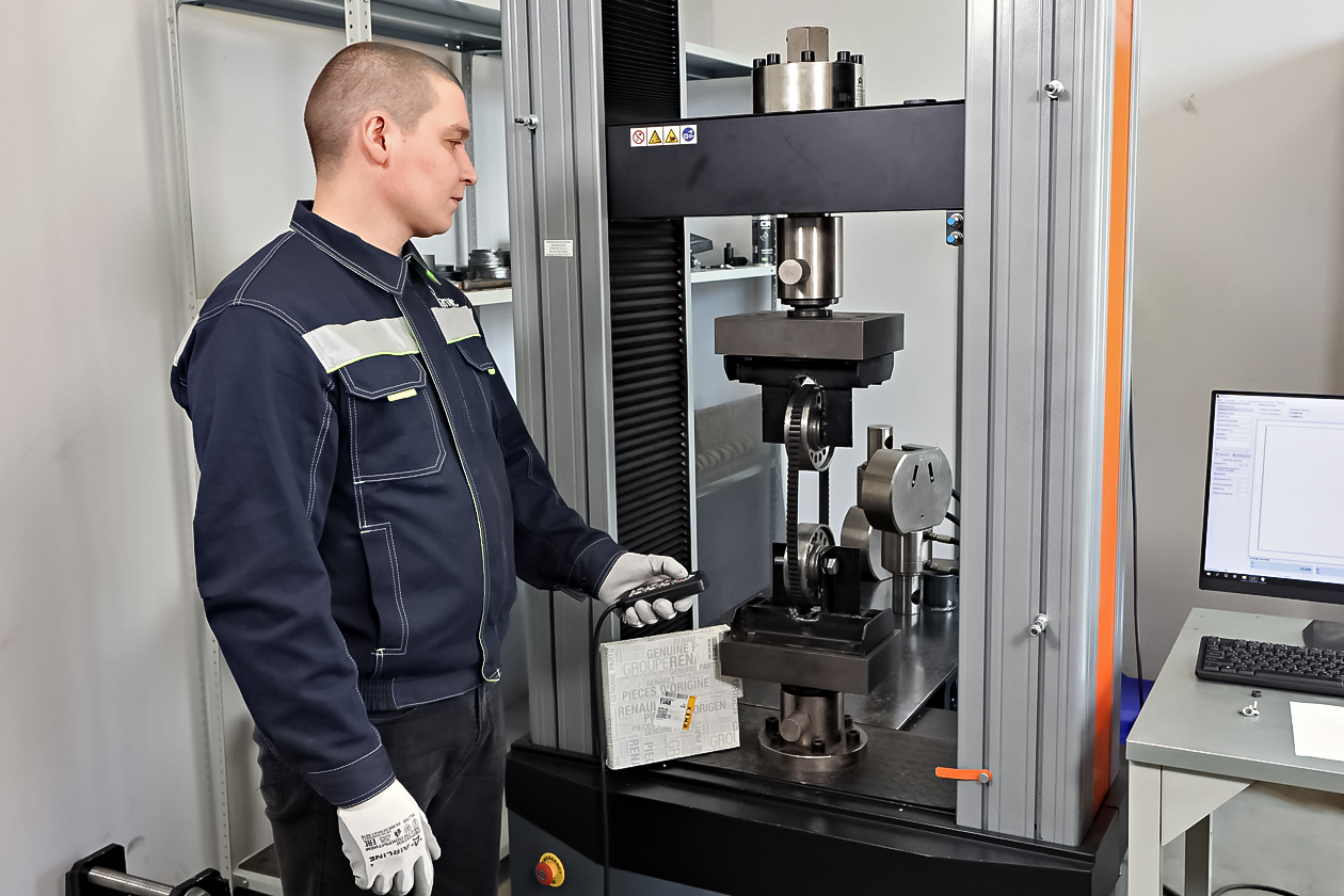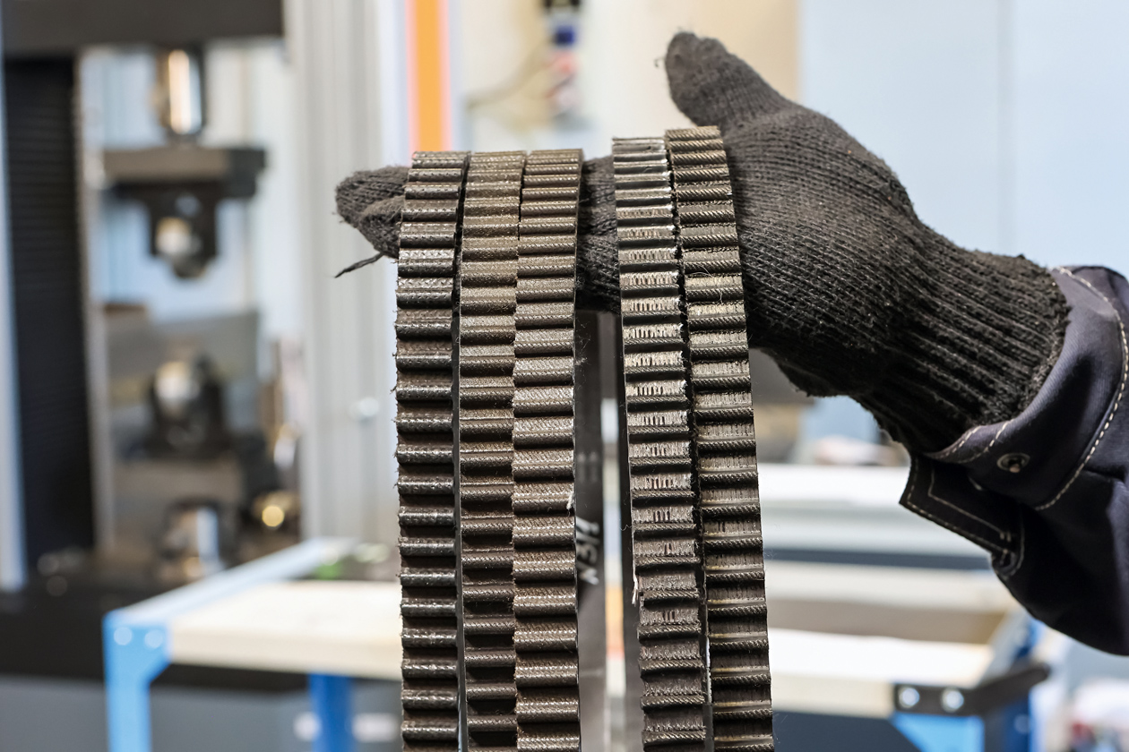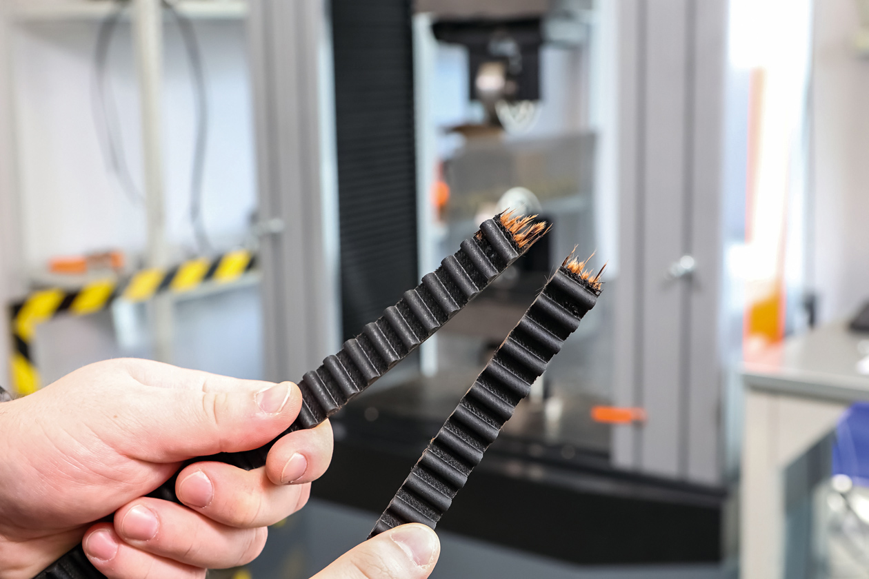 Тест проводился согласно ГОСТ Р ИСО 12046–2017 «Ремни приводные синхронные для автомобилей». Одним из основных параметров ремня ГРМ является прочность его корда при растяжении. Ремни поочередно устанавливались зубьями наружу на гладкие цилиндрические свободно вращающиеся шкивы и растягивались на разрывной машине РЭМ‑300 со скоростью 50 ± 15 мм/мин до разрыва корда.