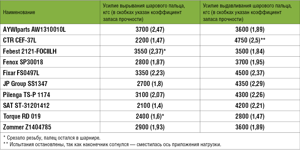 Все купленные нами образцы соответствуют требованиям ГОСТа (более того, коэффициент запаса прочности составляет от 1,4 до 2,5 от норматива), а шаровые пальцы рулевых наконечников изготовлены из предназначенных для этого конструкционных легированных сталей, что и обеспечило хорошие показатели прочности.