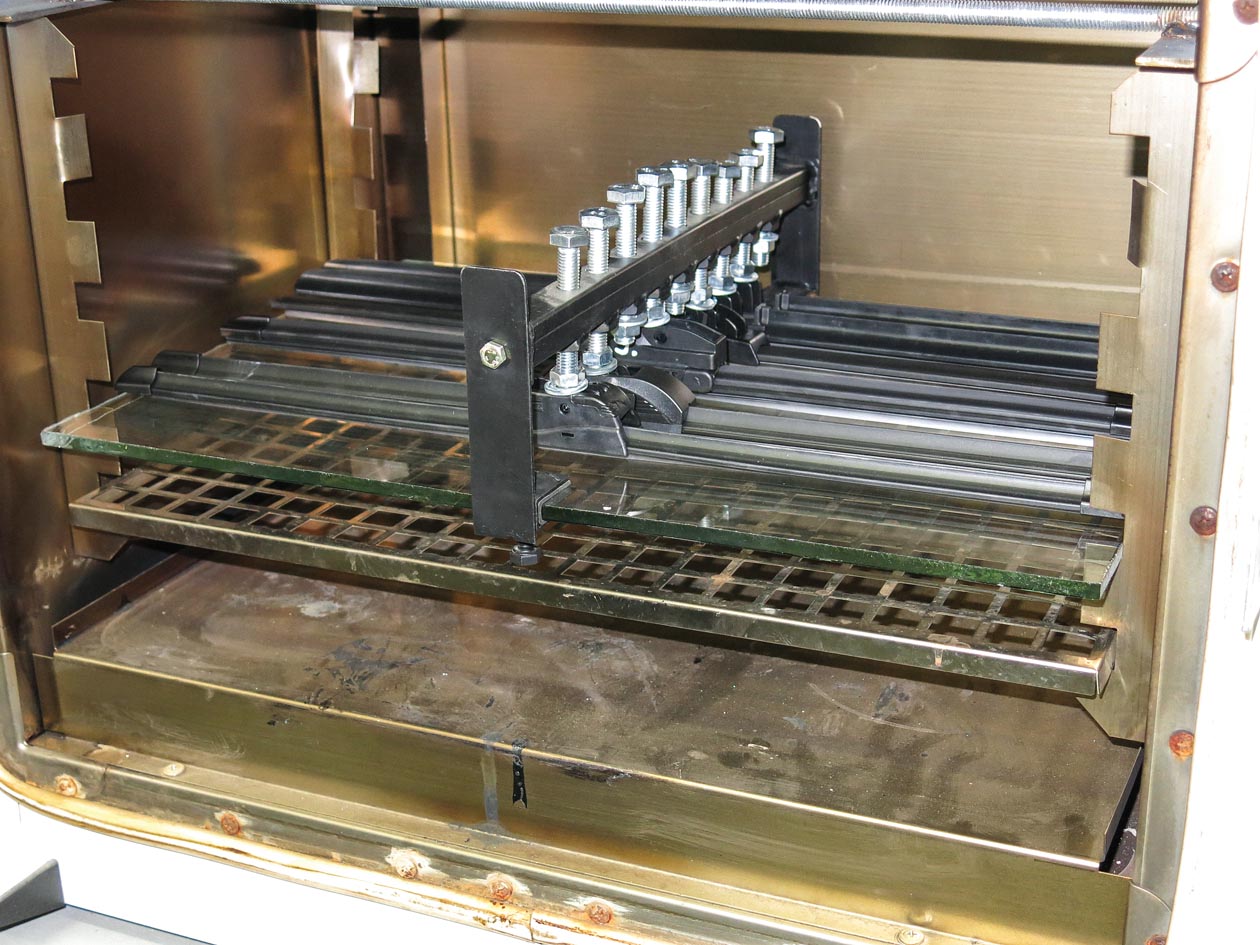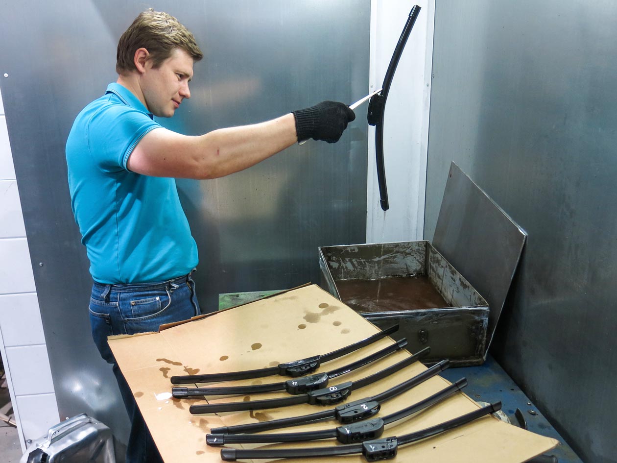 Последней ступенькой стала проверка щеток стеклоочистителя на стойкость к старению в воздухе — это имитация жаркого летнего периода. Щетку прижимают к плоскому стеклу в специальном приспособлении, которое с закрепленными на нем щетками ставят в жаровой шкаф, где нагревают до 60 градусов и выдерживают при такой температуре 96 часов. После щетка устанавливается на стенд проверки качества очистки.