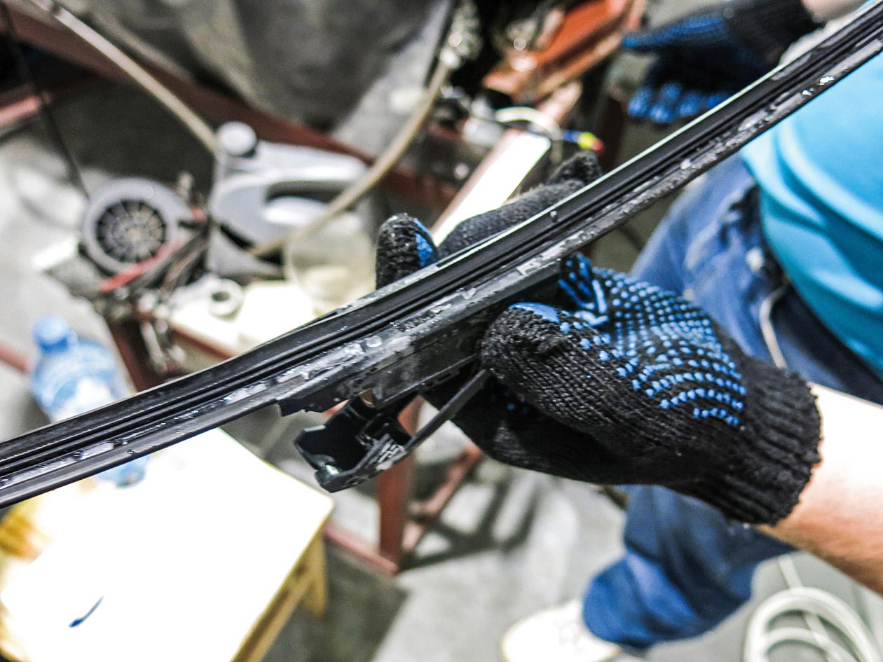 Следующий тест тоже относится к зимнему периоду — проверяется устойчивость резиновой ленты стеклоочистителя к омывающей жидкости (спиртовому раствору).