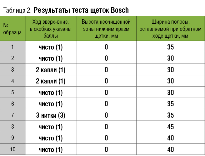 Средний балл качества очистки десяти щеток Bosch при ходе вверх-вниз — 1,2 балла, девять протестированных образцов получают заслуженный (высший) 1 балл, и всего лишь одна щетка — 3 балла.