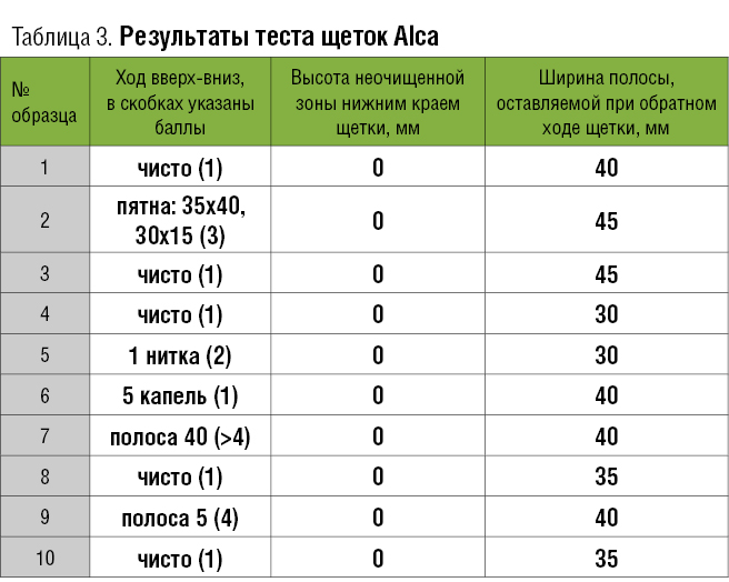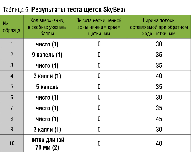 При ходе вверх счищаемая вода попадает на пластиковый корпус щетки, а при обратном ходе слетает на стекло, что и зафиксировано в таблице. Щетка вытягивает при обратном ходе полосу — в среднем шириной 30-35 мм.