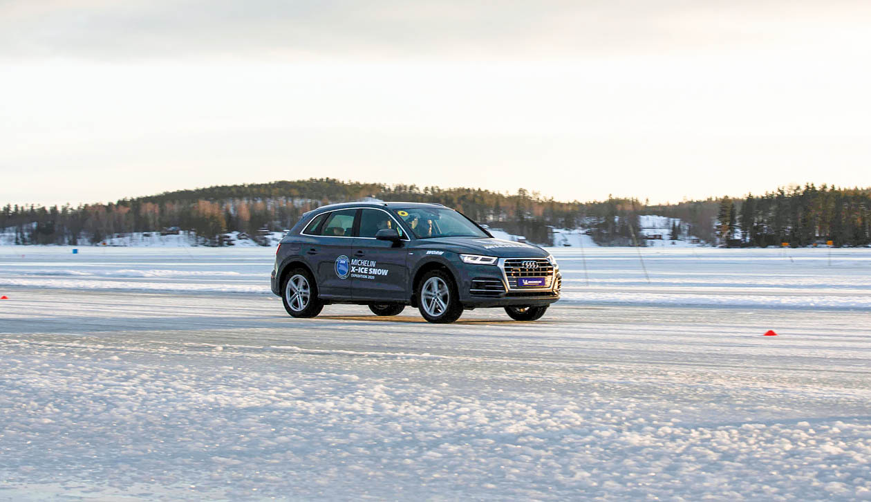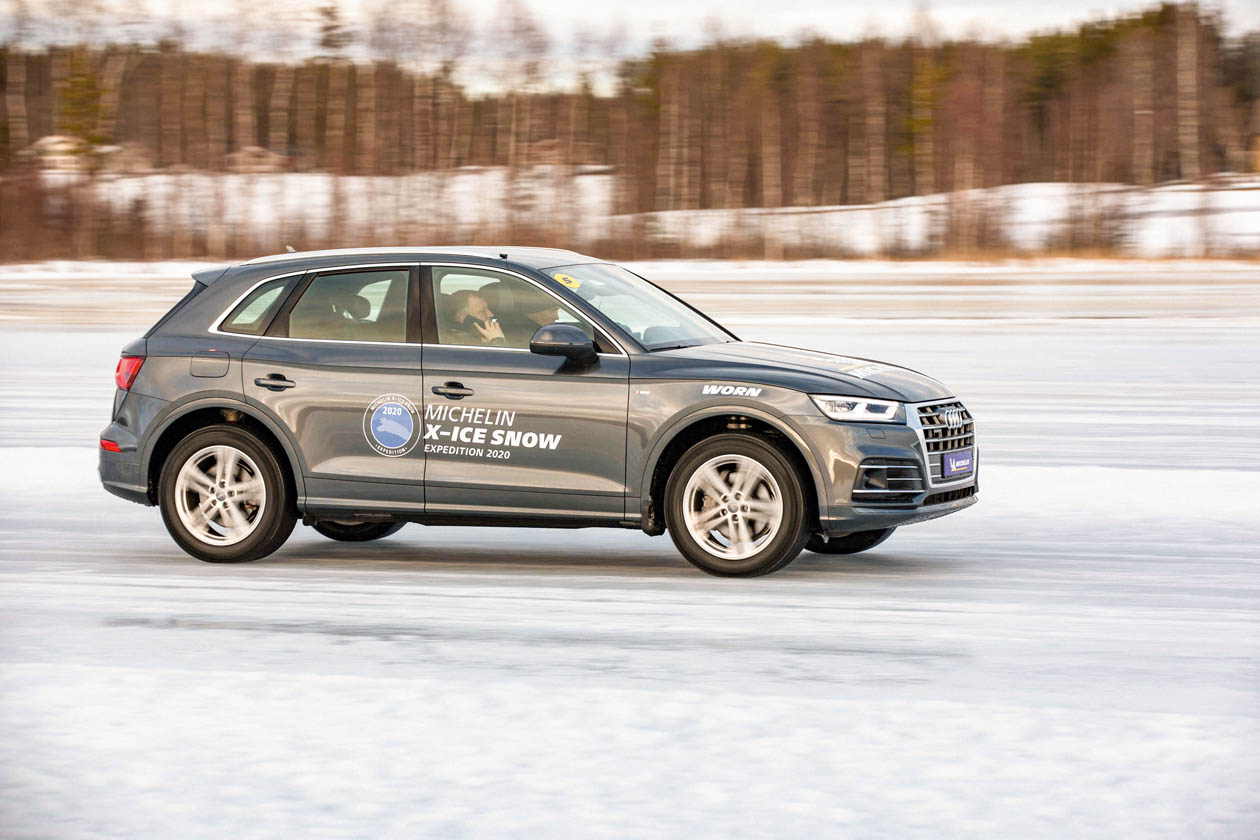 Завершающий этап испытаний — фишка компании Michelin, когда сравниваются специально изношенные до максимума шины конкурентов. Уже в таком потрепанном виде они попали на кроссоверы Audi Q5, которые должны были разгоняться по снежно-ледовой каше до 45 км/ч и максимально эффективно тормозить. Для точности замеров каждый автомобиль был оснащен приборами Racelogic. По результатам большой группы участников среднее значение тормозного пути шин Michelin действительно оказалось наименьшим.