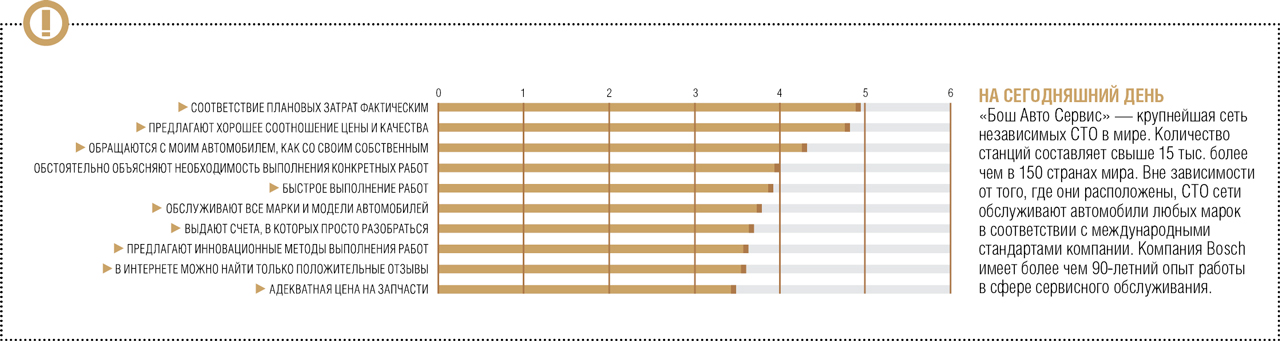 В этой ситуации на первый план выходит профессионализм мастера-приемщика, способного произвести на клиента самое благоприятное впечатление. Bosch провел исследование потребительских предпочтений при выборе СТО. Топ-10 требований клиента к сервису см. на рисунке. Из них половина — соответствие плановых затрат фактическим; обращение с моим автомобилем, как со своим собственным; обстоятельное объяснение необходимости выполнения конкретных работ; выдача счета, в котором просто разобраться, и предложение инновационных методов выполнения работы — напрямую связана с деятельностью мастера-приемщика. Вывод напрашивается сам собой: работа мастера-приемщика непосредственно влияет на репутацию СТО. И как раз в этом направлении система БАС помогает наладить процесс наиболее оптимальным образом. Участникам сети предлагаются обучение в «Бош Авто Сервисе», проведение двухдневного аудита на приемке автосервиса, системная работа по стандартизации процессов, для того чтобы в итоге автосервисное предприятие могло значительно повысить свою прибыльность.