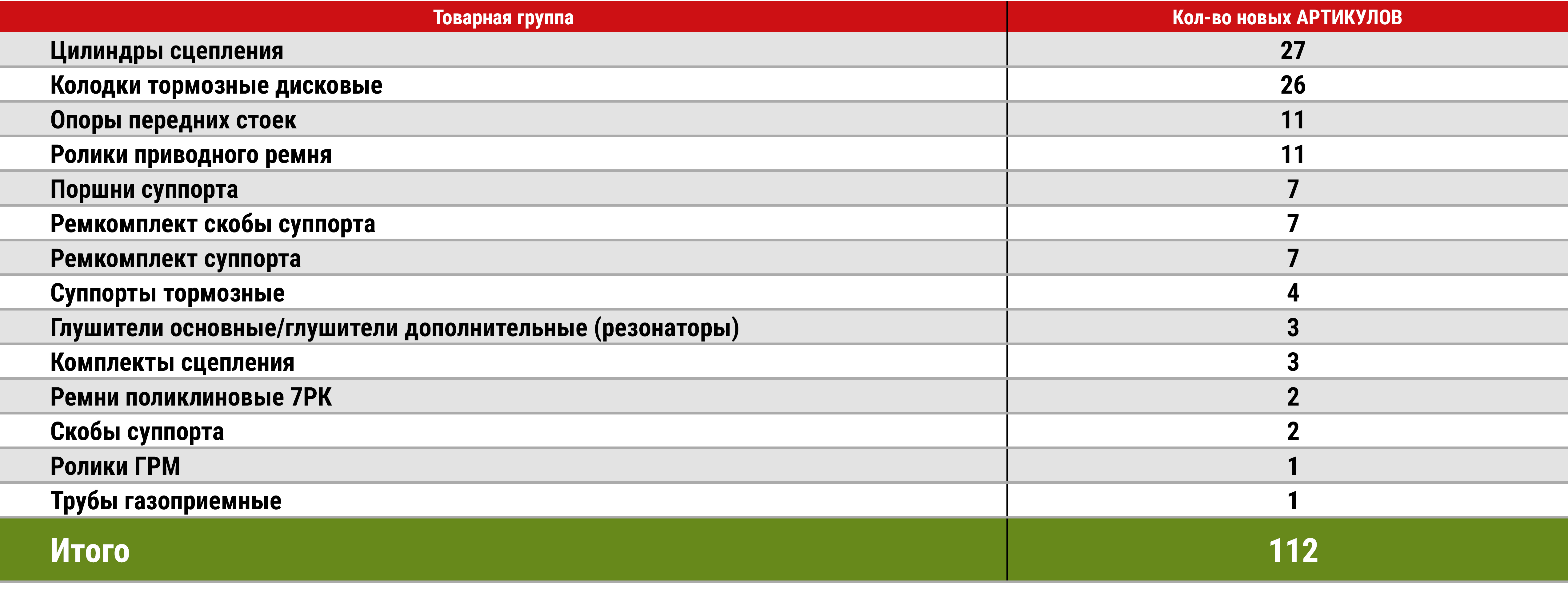 Среди них — цилиндры сцепления (27 новых SKU), колодки тормозные дисковые (26 SKU), опоры передних стоек и ролики приводного ремня (по 11 SKU); поршни суппорта, ремкомплект скобы суппорта и ремкомплект суппорта (по 7 SKU).