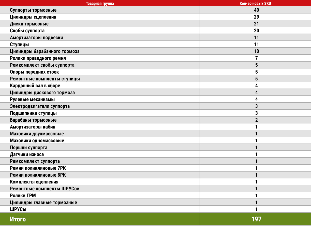 Среди новинок — тормозные суппорты (40 SKU), цилиндры сцепления (29 SKU), тормозные диски (21 SKU), скобы суппорта (20 SKU), амортизаторы подвески (11 SKU), ступицы (11 SKU), цилиндры барабанного тормоза (10 SKU), ролики приводного ремня (7 SKU).