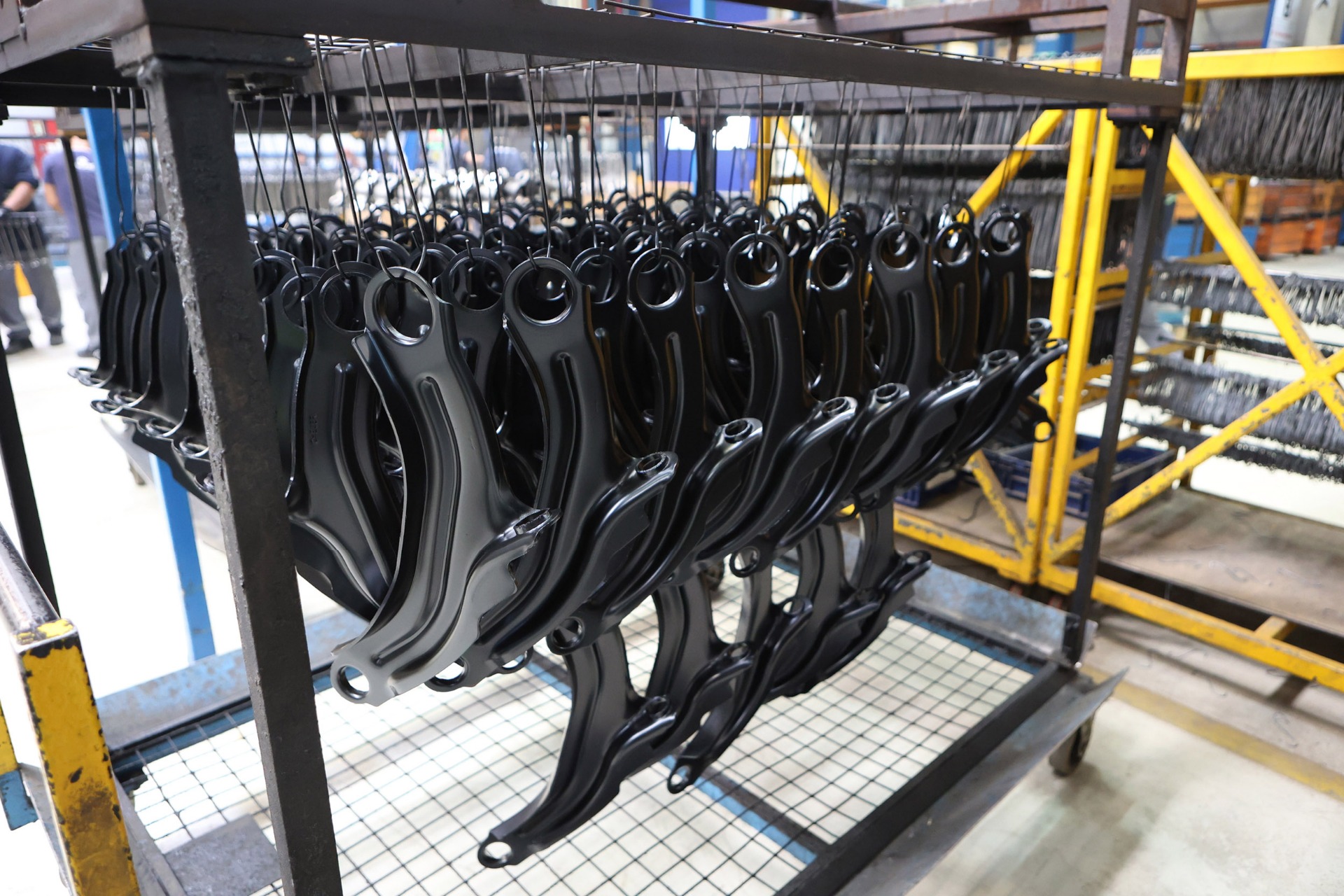 Конечно же, просто придание изделию нужной формы и закалка — это еще не все. Один из финальных этапов — покраска, которая выполняет еще и функцию защитного слоя. Линия катафореза создана, чтобы защитить детали подвески от коррозии. Состоит она из 14 бассейнов, в 10 из которых происходит только отчистка металла детали, и лишь в 11-м осуществляется непосредственное нанесение покрытия, а в следующих ваннах оно фиксируется. Весь процесс катафореза занимает 2 часа 15 минут, после чего деталь «уезжает» в печь и сушится.