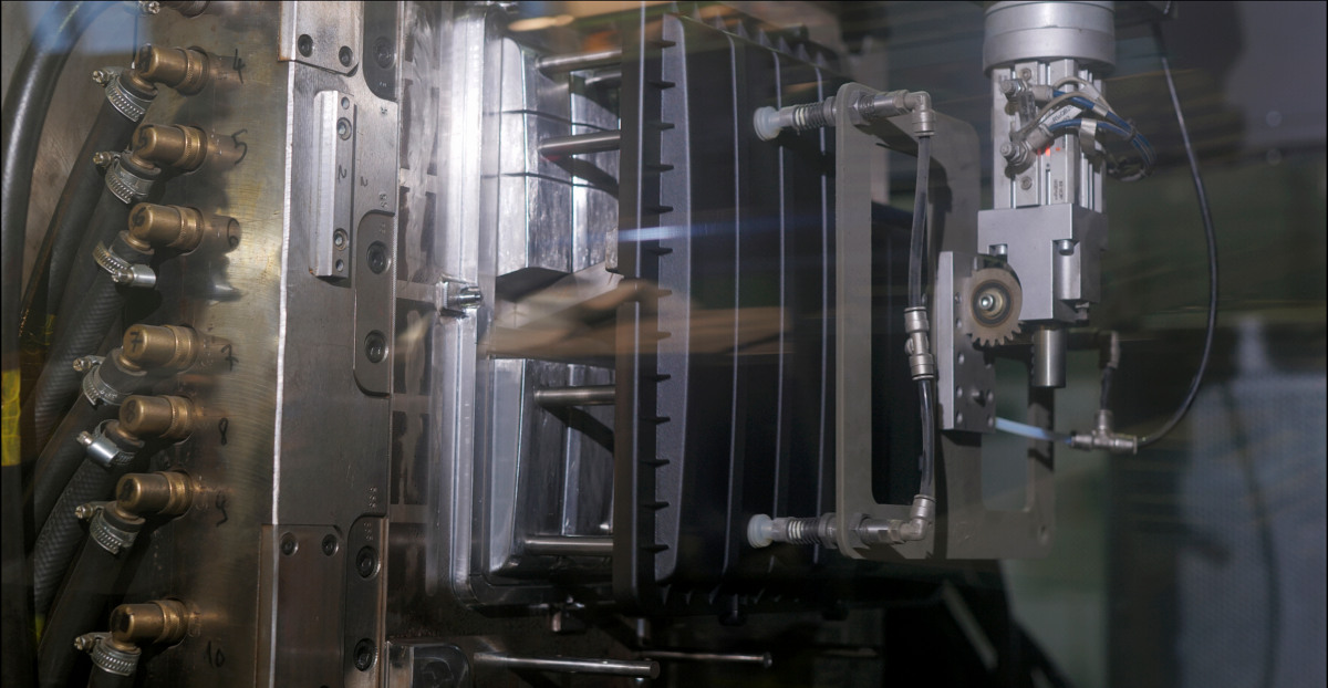 Термопластавтомат Engel. Подача роботом готовой формы на конвейер