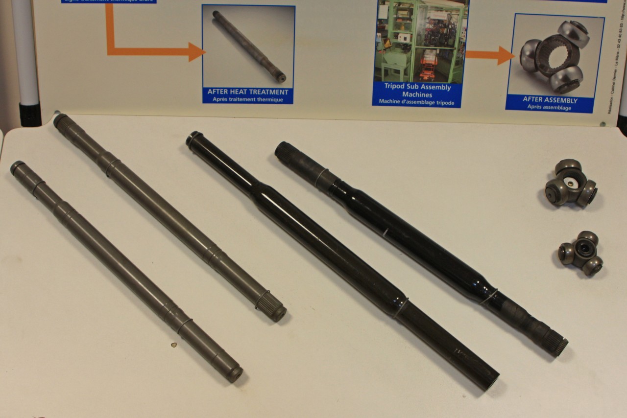 Валы для ШРУСов производятся тут же путем проката металлических трубок. С помощью специального пресса трубки вытягиваются и обжимаются для придания им нужной формы, затем также подвергаются процессу закаливания. Валы для ШРУСов, кстати, полые — это не влияет на прочность, зато уменьшает вес, а значит, и неподрессоренные массы автомобиля, в результате чего увеличивается срок службы подвески.